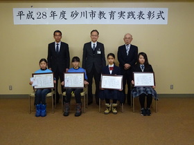 2月24日(金)平成28年度砂川市教育実践表彰式が行われました。この表彰はスポーツ活動、文化活動で顕著な成果が認められる個人及び団体に対し、表彰を行うもので、今年度は砂川高校スキー部で全国大会出場の吉田好さん、砂川中学校1年生でバレエコンクール出場の新崎日菜子さん、中央小学校5年でマウンテンバイク大会出場の久保千夏さん、中嶋理央さんが受賞されました。受賞者4名は国際大会または全国大会で優勝、準優勝するというすばらしい成績を残されています。この日は、髙橋教育長から一人一人に表彰状と記念品が渡されました。今後も引き続きのご活躍をご祈念いたします。