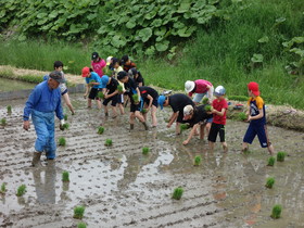 児童たちは、おそるおそる裸足で水の抜かれた田に入り、まっすぐにひかれた目印を目標に苗を2,3株ずつ手に取り植えました。