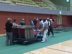 高齢者軽スポーツフェスティバルを翌日に控えた7月11日(火)総合体育館では会場の設営が行われ、主催者である市(介護福祉課)、老人クラブ連合会の役員の皆様およびささえあいセンター(地域包括支援センター)の職員のほか、民生児童委員協議会の皆様がボランティアでご協力いただきました。