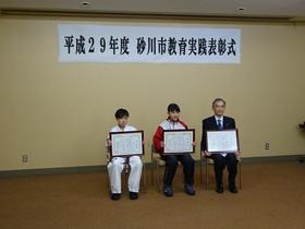 2月27日(火)平成29年度砂川市教育実践表彰式が行われました。この表彰はスポーツ活動、文化活動で顕著な成果が認められる個人及び団体に対し、表彰するもので、今年度は9期17年にわたり社会教育委員として社会教育の充実、発展に功績をあげられ、現在社会教育委員の会議の委員長の松原重俊さん、全国小学生ABCバドミントン大会北北海道予選会及び全国小学生ABCバドミントン大会で優勝された中央小学校6年生の石岡空来さん、極真館北海道青少年空手道選手権大会で準優勝、全日本青少年空手道選手権大会で3位入賞、さらに全世界青少年空手道選手権大会で3位入賞の豊沼小学校6年生の佐藤大輝さんが受賞され、この3名のすばらしい功績に、髙橋教育長から表彰状と記念品が渡されました。おめでとうございます。今後もさらなるご活躍をご祈念申し上げたいと思います。