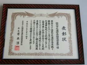 砂川市では、9月13日をもって「交通事故死ゼロ300日」を達成し、北海道交通安全推進委員会より砂川市交通安全推進委員会に対して表彰状が贈られました。