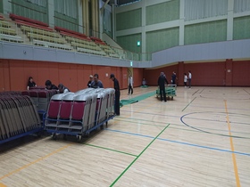 翌日に開催される高齢者軽スポーツフェスティバルを控え、9月25日(火)、総合体育館で準備作業が行われました。
