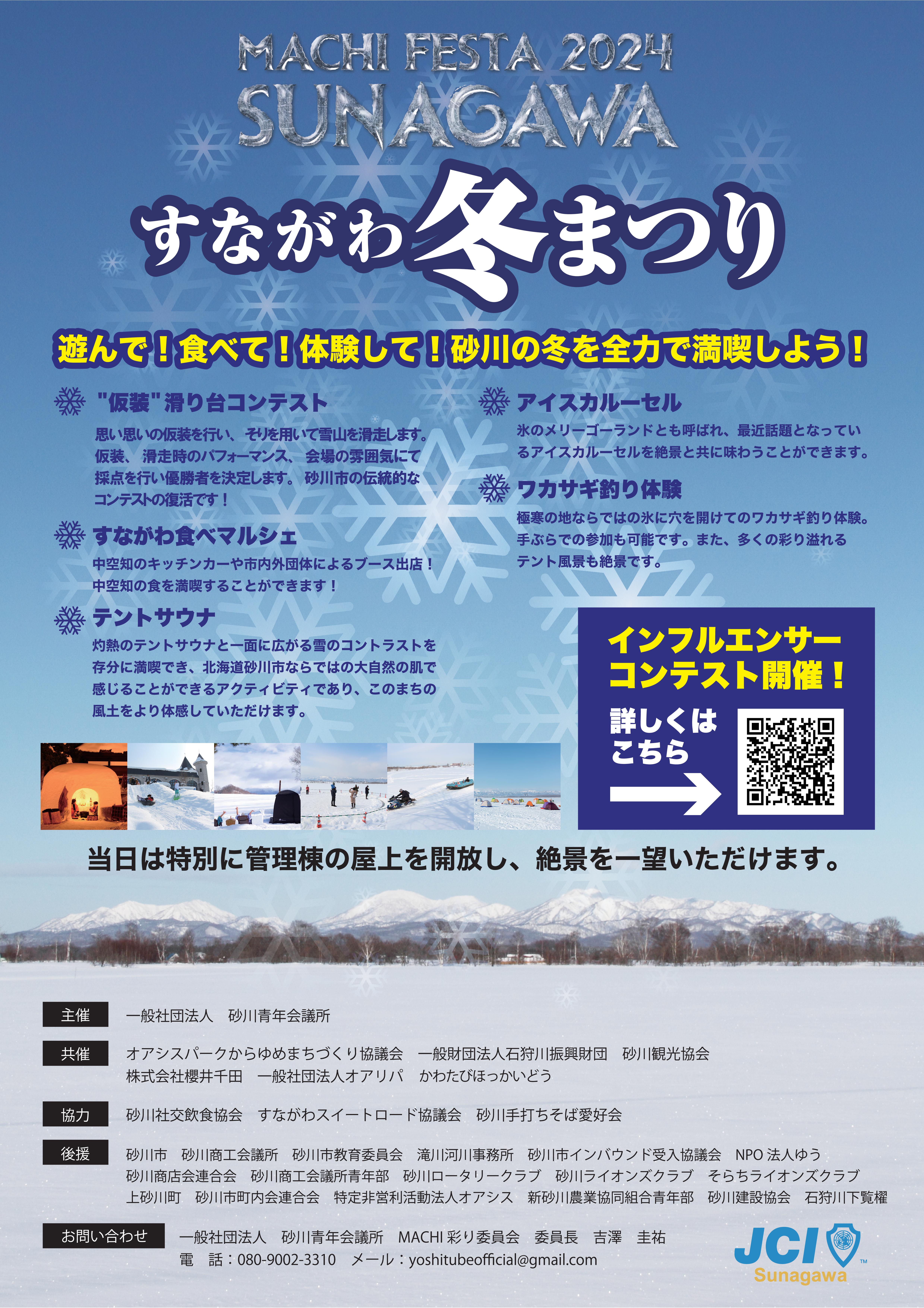 経済部長 野田です。一般社団法人 砂川青年会議所の主催で、2月11日(日)に開催されますイベント「MACHI FESTA 2024 SUNAGAWA すながわ冬まつり」の告知です。色々な催しが予定されています。「”仮装“滑り台コンテスト」「ワカサギ釣り体験」「アイスカルーセル」「かまくらづくり」「テントサウナ」「雪山滑り台」「すながわ食べマルシェ」などです。砂川市のオアシスパークで、冬の1日を楽しみませんか。(詳細は、チラシをご覧ください。)