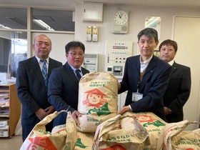 学校給食センターに熊谷智克会長(写真中央左側)、杉本雄馬副会長(写真右側)、渡辺達郎副会長(写真左側)が来所され、贈呈セレモニーの中で、熊谷会長から「ことしも高品質のゆめぴりかができました。“地産地消”で、子どもたちに地元のお米を食べてほしいという思いで寄贈を続けています。お米自体がとても美味しいので、ぜひ一口目はお米だけで食べてみてください。」とご挨拶をいただきました。