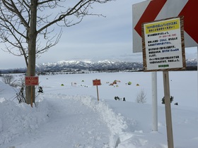 皆さまから問い合わせをいただいておりました「砂川遊水地のワカサギ釣り」が、本日10時から始まりました。10時20分現在で駐車場に23台が駐車していました。その後、市役所から氷上を見てみるとテントがだんだん増えていきました。明日以降は、安全管理上7時から16時30分までとなっておりますので、ルールを守り安全に楽しんでください。