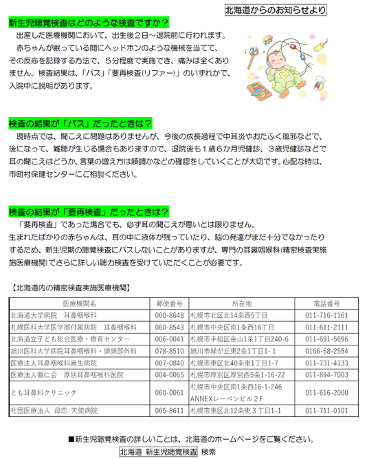 砂川市では、令和2年10月1日から、新生児聴覚検査の費用助成をしています。