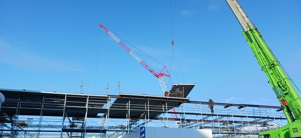 ▲クレーンによる仮設上屋パネル掛け作業
