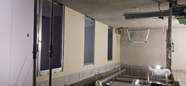 サブアリーナの壁工事 吹き抜け部にはステージが組まれています