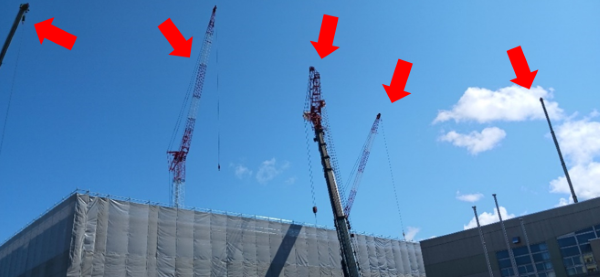 今日はクレーンが5台稼働していました。建設資材が多いのでクレーンの稼働率も高くなっています。