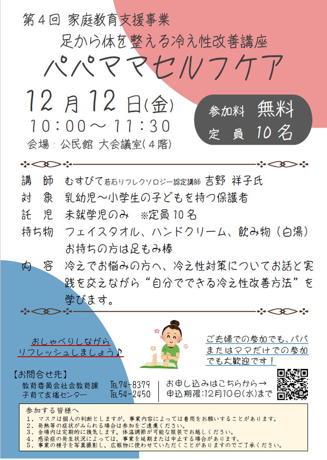 パパママセルフケア(足から体を整える冷え性改善講座)開催のお知らせ