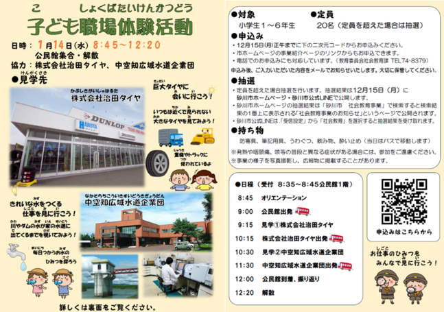 砂川市内の事業所におじゃまして職場体験活動をします。巨大なタイヤを近くで見たり、きれいなお水を作る仕事を見に行きましょう!皆さんの申込みをお待ちしています。