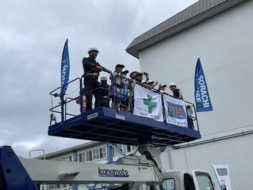 憩岳会と空知建設業協会が、社会貢献事業として続けていただいており、今年は6月の豊沼小学校に続いて、砂川小学校でも協力いただいています。私も一緒に高所作業車で上空の景色を見せていただきました。ありがとうございます。