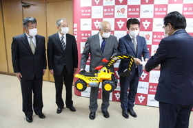 砂川建設協会三土会長、建設協会地域振興委員会増田委員長、建設協会増井副会長、地域振興委員会橋爪副委員長が市長室に来られ、今年コロナ禍で地域振興委員会の事業である地域の子どもたちが大型建設機械と触れ合う事業(建設業の担い手の発掘等)ができなかったことから、空知太保育所、さくら保育園、ひまわり保育園に建設機械の乗用玩具16台を寄贈していただきました。