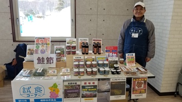 恒例となった香西農園さんの焼き芋(今日のおいもは紅甘雪)。いのもとファームさんのトマトジュース(ミニトマト)、畑野自然食品さんのコーナー、”高血圧を自力で下げる”の字に引き寄せられサラダ昆布を試食。いける!