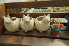 以前アルパカの入れ物に入っている多肉植物を見かけたので、今回写真を撮ろうとしたが売り切れていて入れ物だけ。多肉植物の寄せ植えは娘さんがやっているとのこと。