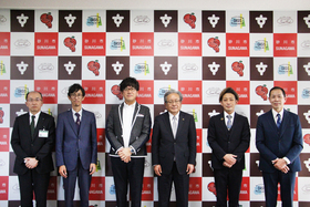 (写真は左から湯浅副市長、斎藤邦宏すながわリバーズ副代表、SHIRO福永敬弘代表取締役社長・すながわリバーズ代表、市長、盛川竜太応援団長、みんなのすながわプロジェクト田伏準備室長)