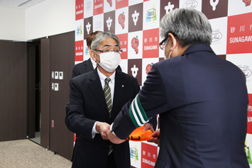 ライオンズクラブ村中会長、ロータリークラブ永森会長が市長室に来られ、それぞれ100枚(交通安全旗50枚、飲酒運転撲滅旗50枚)合計200枚の寄贈を受けました。
