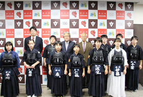 第34回忠臣蔵旗少年剣道大会に砂川錬心舘の小学生7名、中学生3名が出場することから、砂川少年剣士父母の会の皆さんと市長室へ挨拶に来ました。