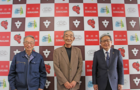 議会傍聴に来た市役所OBの是枝喬さん(写真中央)と岩崎商店の岩崎良一さん(写真左)が昼休み市長室に来られた。