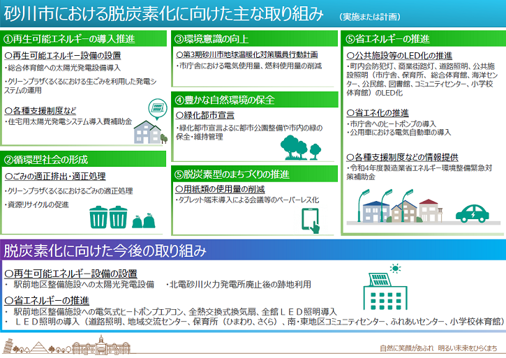 砂川市における脱炭素化に向けた主な取り組みは、以下のとおりです。
