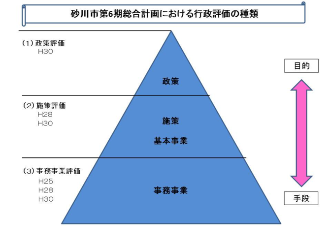行政評価は、これら「(1)政策」・「(2)施策および基本事業」・「(3)事務事業」の各レベルで行うことができ、それぞれ、(1)政策評価、(2)施策評価、(3)事務事業評価に分類できます。