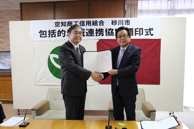 砂川市と空知商工信用組合は、地方創生に関する地域経済の活性化に関する事項などの実施において、積極的な連携及び協力を行うことにより、産業の振興及び発展に寄与することを目的に、平成28年11月28日に「地方創生に関する包括的地域連携協定」を締結しました。