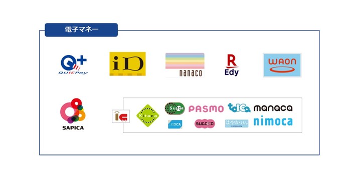 交通系電子マネー(Kitaca、Suica など)、SAPICA、QUICPay、iD、楽天Edy、WAON、nanaco