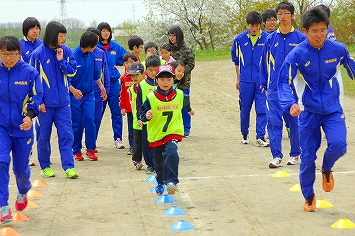 スキップやカニさん歩きなどに加えて、ふだん高校陸上部でやっている難しいトレーニングも取り入れて、股関節などの可動域を増やしていき速く走る練習をしました。