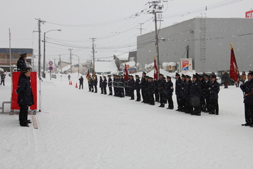 無火災・無災害を祈念する、毎年恒例の「消防出初式」が行われました。分列式では、消防職団員や消防車両などが堂々と行進しました。また、はしご乗りの演技では、高さ6.6mのはしごの上で技を披露し、見物者からたくさんの歓声が上がりました。皆さんも、これからの季節、火災などに十分注意しましょう。
