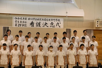 市立病院付属看護専門学校で「第29期生看護決意式」が行われました。これは、第29期生となる平成31年度入学生30人が、10月29日から始まる市立病院でのはじめての臨地実習に向け、看護専門職に対する職業意識を高め、その責任の重さを自覚し、決意式の場で看護師を目指す意思を表明することを目的としています。岩木市立病院看護附属専門学校学校長や平林市立病院事業管理者、敦賀看護部長などからそれぞれ祝辞が述べられ、実習に向けてのエールが送られていました。その後、第29期生による合唱やキャンドルサービス、決意の言葉が述べられ、入学から約半年で培ってきた看護技術をもとに実習に臨み、理想の看護師を目指す決意を誓いました。