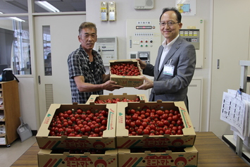 砂川ミニトマト部会の関尾部会長より、学校給食用の「ミニトマト」39キログラムの寄付を受けました。平成25年度から寄付をいただいており、今回で10回目となります。地元で採れた野菜を食べてほしい、砂川の野菜に興味を持ってほしいという目的のもと寄付していただきました。